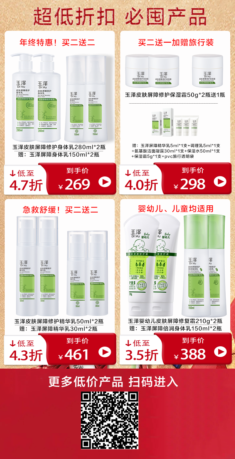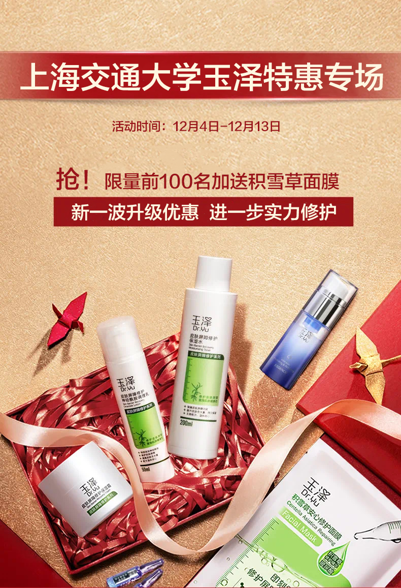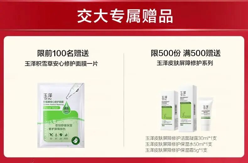 另,折后金额满500元,赠送玉泽皮肤屏障修护小套装一份,限量500份,送完即止。