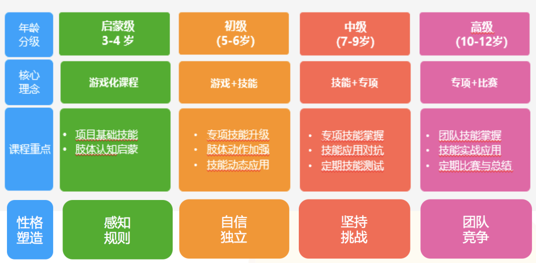 覆盖3-12岁全年龄段学员,逐步进阶,以体适能教育+足球为基础,专注于系统化教育。
