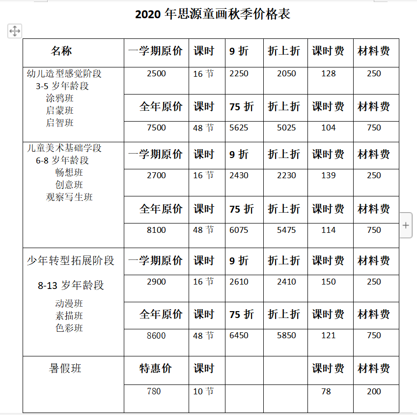 备注:报暑期班材料费200元,一期250元,全年750元,材料费不打折,暑期特惠班不享受优惠二至四方案。