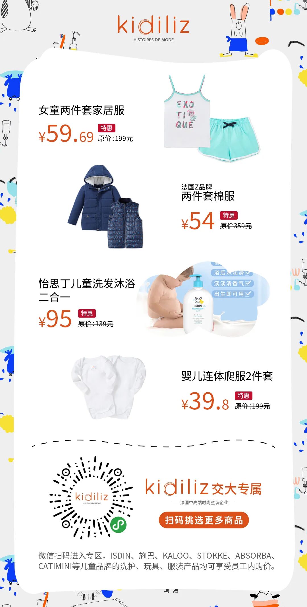 微信扫码进入专区,ISDIN、施巴、Kaloo、Stokke、absorba、catimini等儿童品牌的洗护、玩具、服装产品均可享受员工内购价。(活动时间至8月10日)