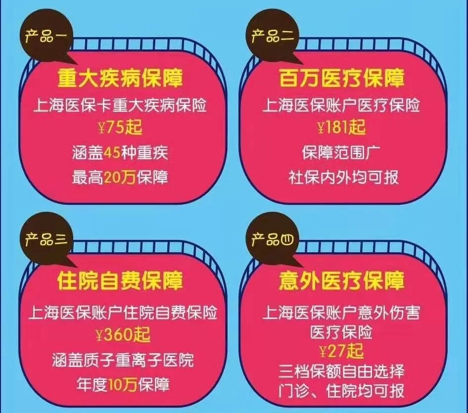 上海医保账户医疗保险(百万医疗)+ 上海医保账户重大疾病保险是首推的黄金搭档。重大疾病险为给付型保险,确诊即赔;百万医疗保险为报销型保险,凭发票等材料进行赔付。