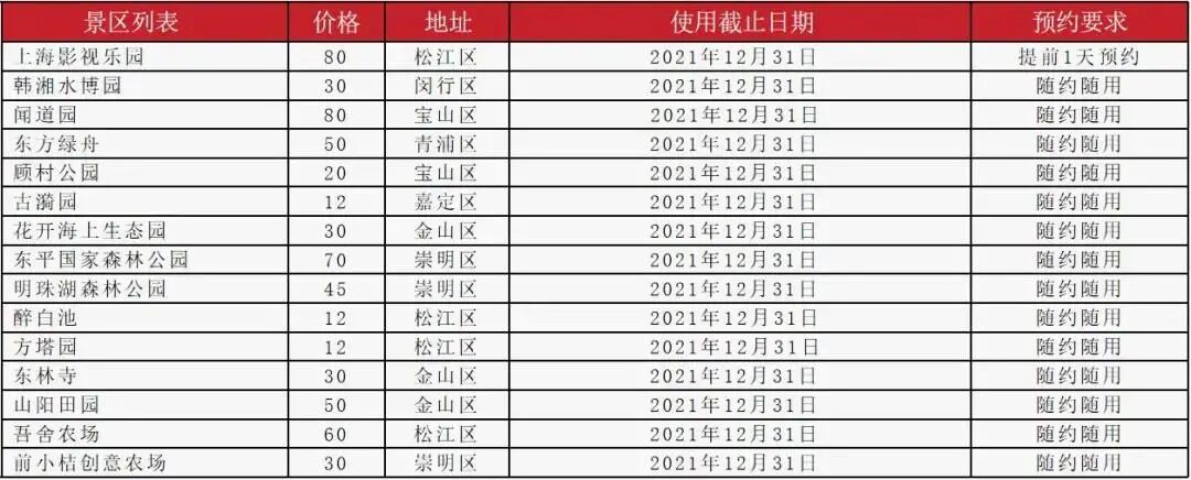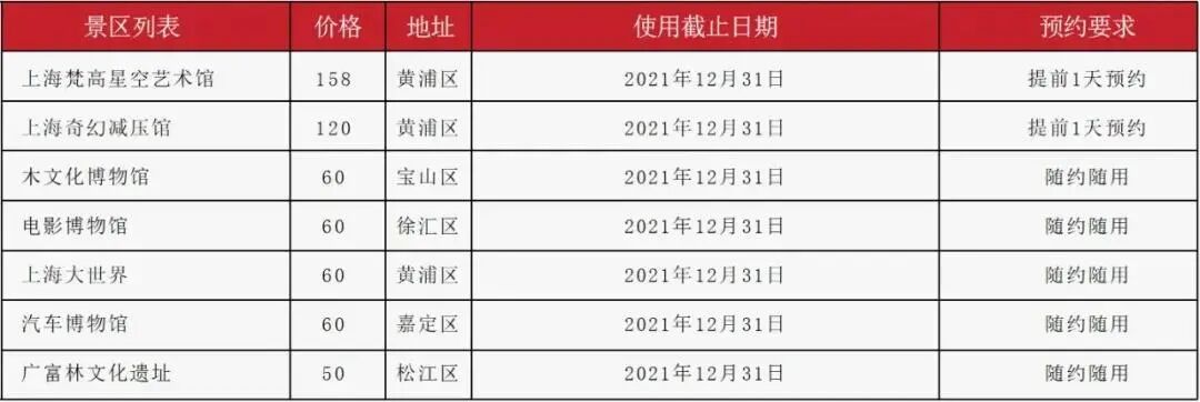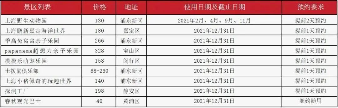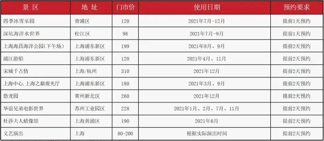 注:四季冰雪乐园限2021年7月-12月使用;深坑海洋水世界限7月-9月使用;上海海昌海洋公园(下午场)限2021年8月、9月使用;上海中心.上海之巅观光厅限2021年3月、9月使用;华谊兄弟电影世界限2021年2月、7月、11月使用;文艺演出排期根据实际演出时间上新。